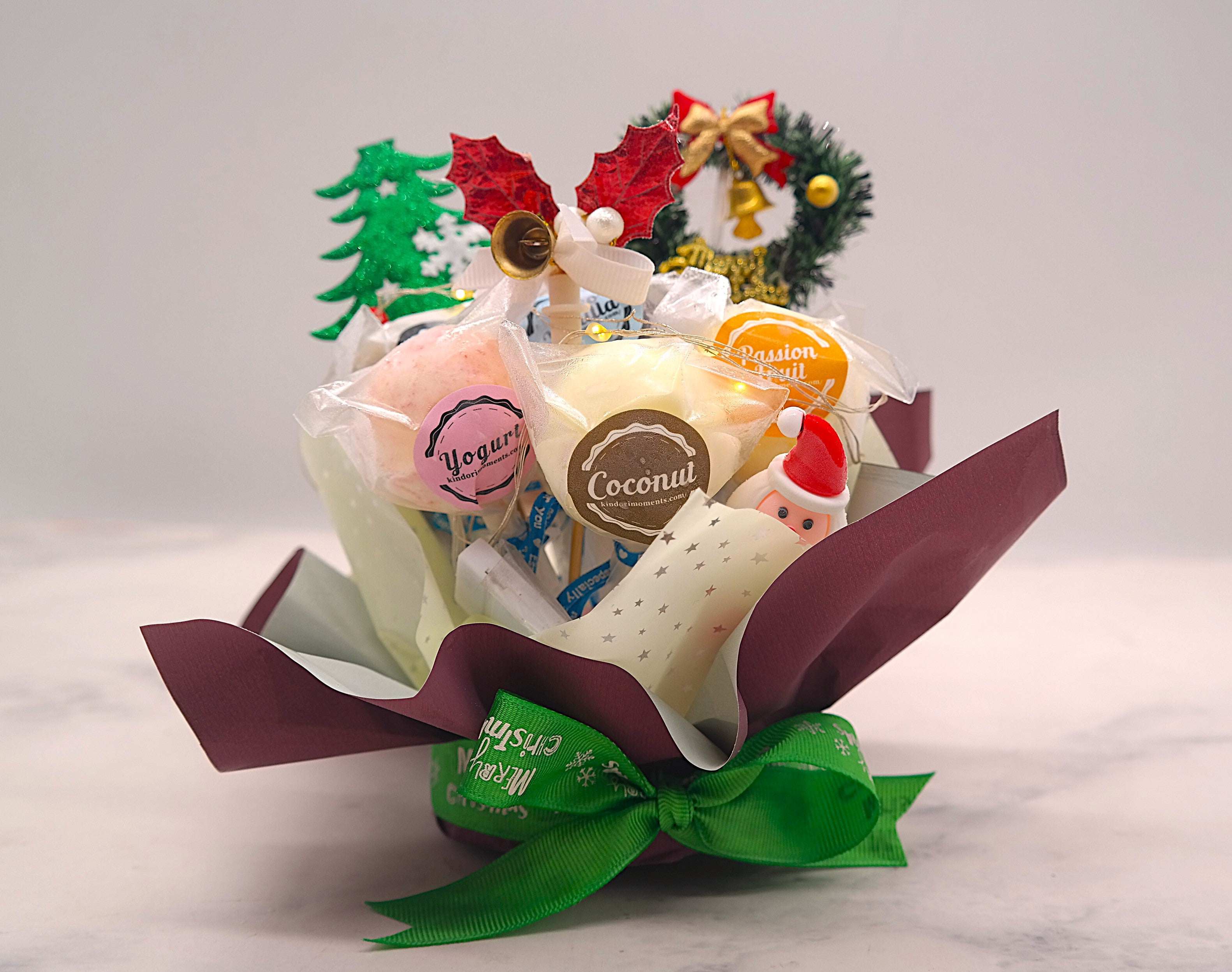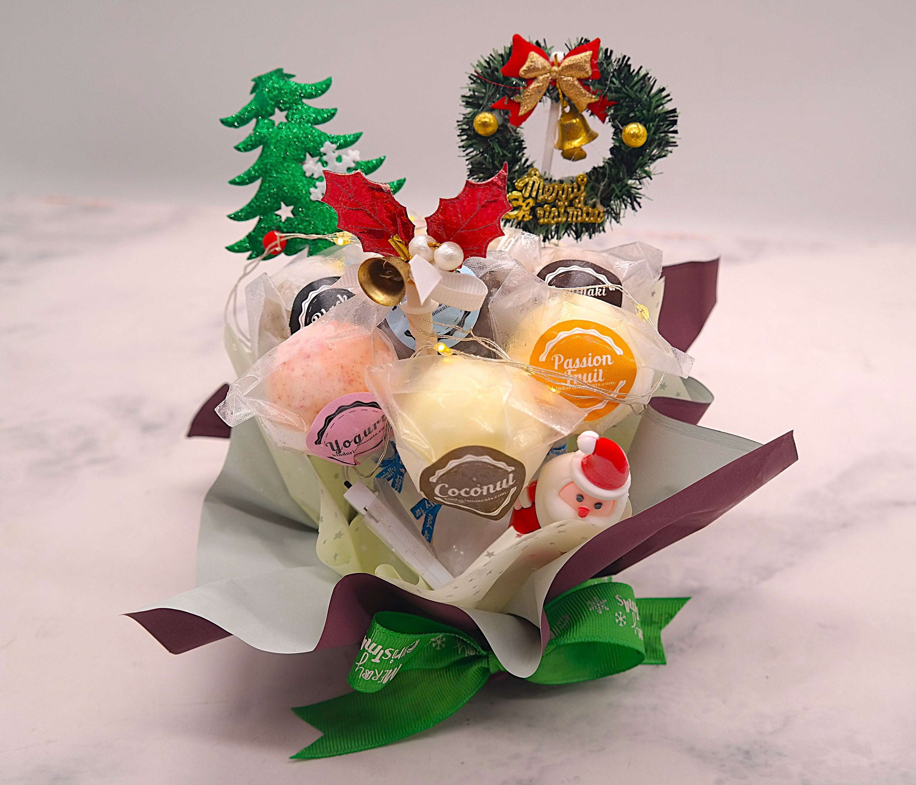 This festive “flower pop” bouquet is a charming Christmas-themed arrangement featuring individually wrapped treats styled like blooming flowers. The pops come in 10 sticks mix flavours such as Vanilla, Dark Chocolate, Mint Chocolate Chips, Oreo Vanilla, Mocha Oreo, Black Sesame, Sumiyaki Coffee, Strawberry, Passion Fruit, Coconut, Mango or Yogurt each wrapped in soft pastel packaging that mimics delicate petals.